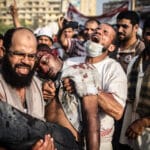Mısır’ın başkenti Kahire’de Adaweya Meydanı’nda sniper ile başında vurulan bir genç ve onu taşıyan iki adam | Fotoğraf: Mosa’ab Elshamy / 27 Temmuz 2013