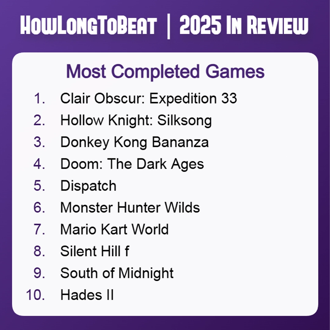 2025 yılında en çok tamamlayan oyunlar şu şekilde sıralanıyor: