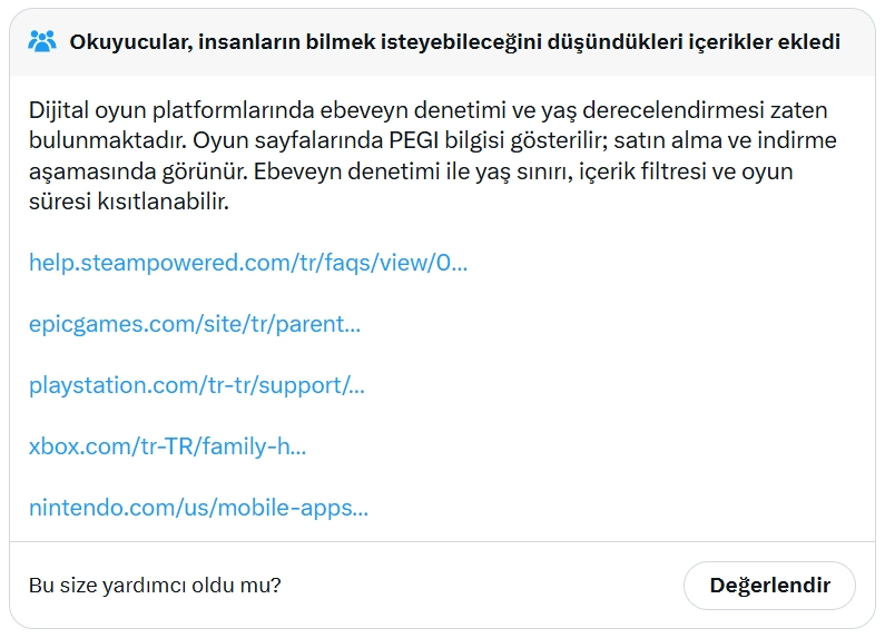 Oyun sayfalarında PEGI bilgisinin yer aldığını belirten topluluk notları, aynı zamanda satın alma ve indirme aşamasında da bunun göründüğüne işaret ediyor. Ebeveyn denetimi sayesinde yaş sınırı, içerik filtresi ve oyun süresinin kısıtlanabileceği aktarılıyor.