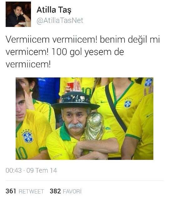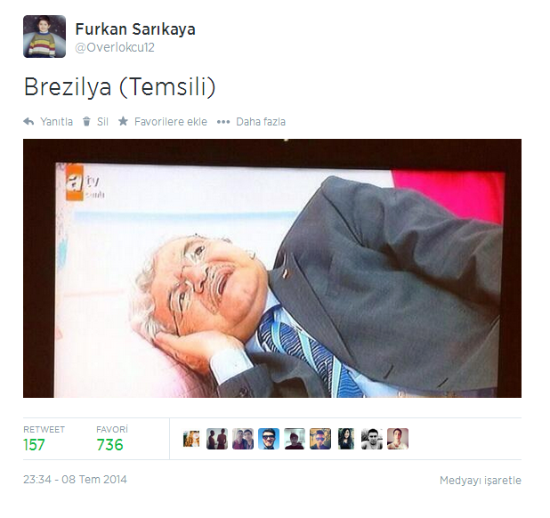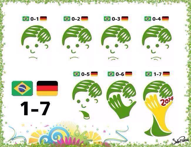 Dünya Kupası tarihinin belki de hiç unutulmayacak maçları arasına giren Brezilya (1) – Almanya (7) maçının bu inanılmaz atmosferi, Brezilya taraftarlarına acı bir üzüntü verirken, ters bir şekilde maç üzerinden yapılan esprilerin de önüne geçilemedi.