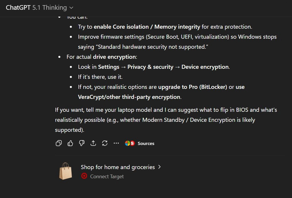 Sosyal medyada yer alan @BenjaminDEKR adlı bir kullanıcı, ChatGPT Plus abonelik planına sahip olmasına rağmen Windows BitLocker’ın ABD’deki Target mağazasında “ev ve market alışverişi” yapmayı teklif ettiğine dair bir sohbetin ekran görüntüsünü paylaştı. Aşağıdan bu görüntüyü inceleyebilirsiniz: