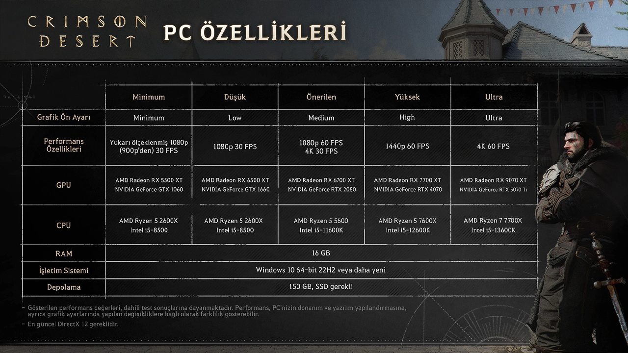 - Crimson Desert, tüm grafik ayarlarında 150 GB boş depolama alanı talep edecek.
