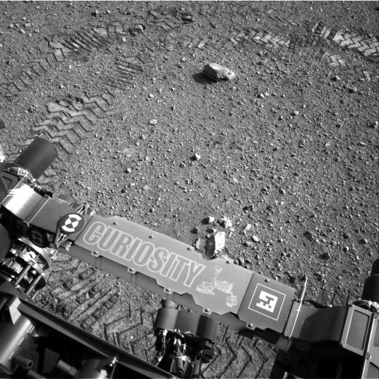 İlk Adımlar: Curiosity’nin yüzeyde bıraktığı izler. Bu izler daha sonra kaşif robotonun navigasyonunu belirlemede kullanılmıştır. (Fotoğraf: NASA/JPL-CALTECH)