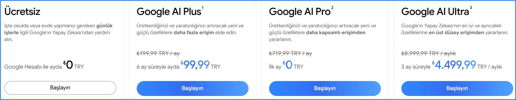 - En gelişmiş paket olan 8.999,99 TL'lik Google AI Ultra ise 3 ay süreyle 4.499,99 TL'ye elde edilebiliyor.