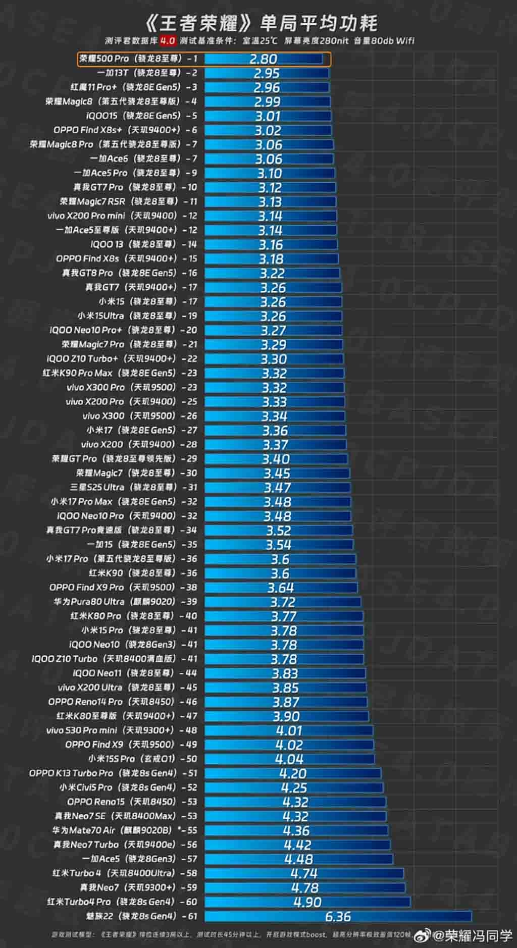 Karşılaştırmaya OnePlus 13T, Red Magic 11 Pro Plus, iQOO 15 ve Honor Magic 8 Pro gibi cihazlar dahil edildi. Tüm katılımcılar arasında Honor 500 Pro, oyunlarda enerji verimliliği konusunda birinci sırada yer aldı.