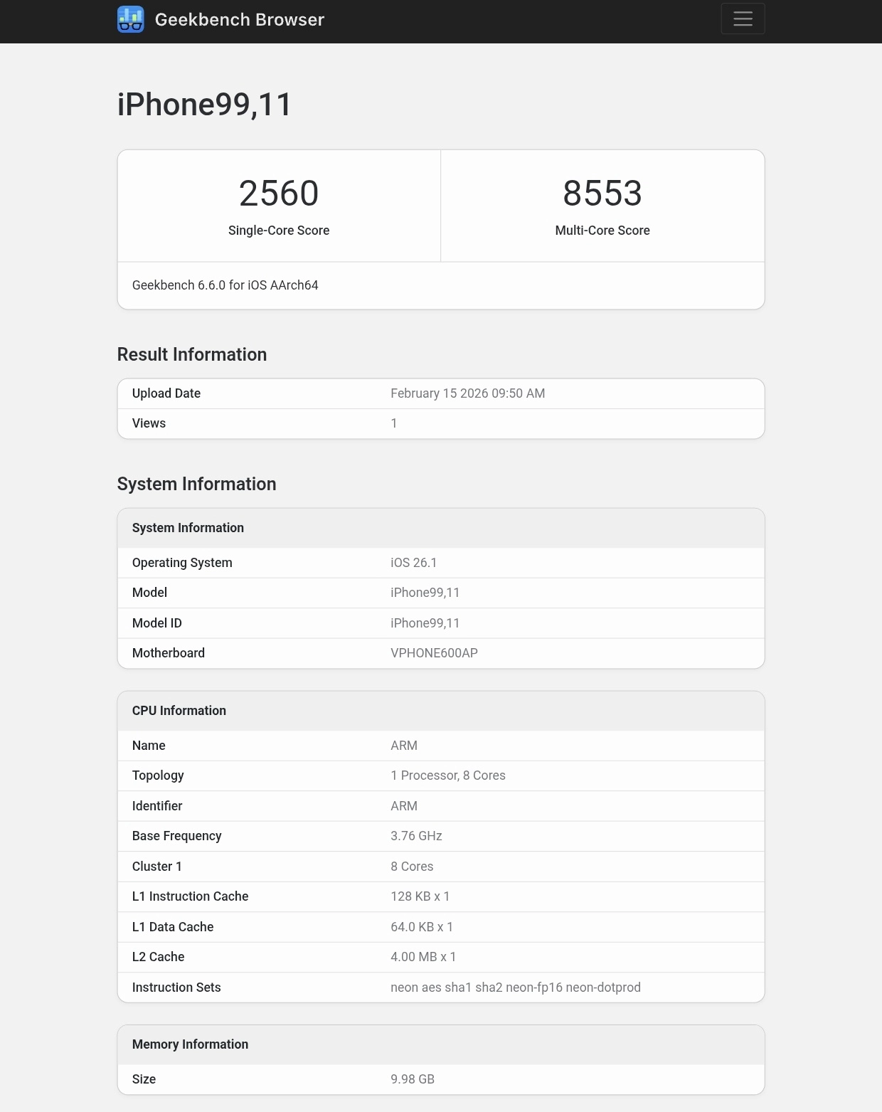Abhishek Yadav tarafından aktarılan bilgilere göre iPhone 17e modeli Geekbench platformunda test edildi. Merakla beklenen model bu testlerden 2.560 tek çekirdekli ve 8.553 çok çekirdekli puan elde etmeyi başardı.