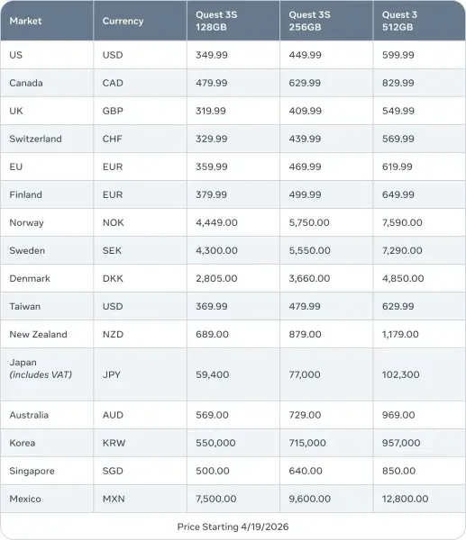 GameInformer’ın haberine göre bugünden itibaren dünya genelinde Meta Quest 3 ve 3S fiyatları zamlanıyor. Mark Zuckerberg liderliğindeki şirketin VR cihazlarının güncel fiyat etiketleri şu şekilde karşımıza çıkıyor: