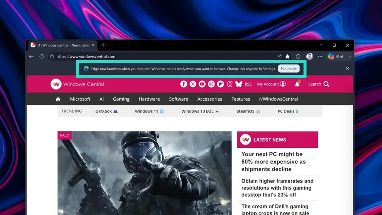 İlk olarak Windows Central ekibi Windows 11’in bu yeni özelliğini tespit etti. Tarayıcının üst kısmında, Edge’in “artık Windows’a giriş yaptığınızda başlatıldığını” bildiren bir banner yer alıyor. Aşağıdaki ekran görüntüsünü inceleyebilirsiniz: