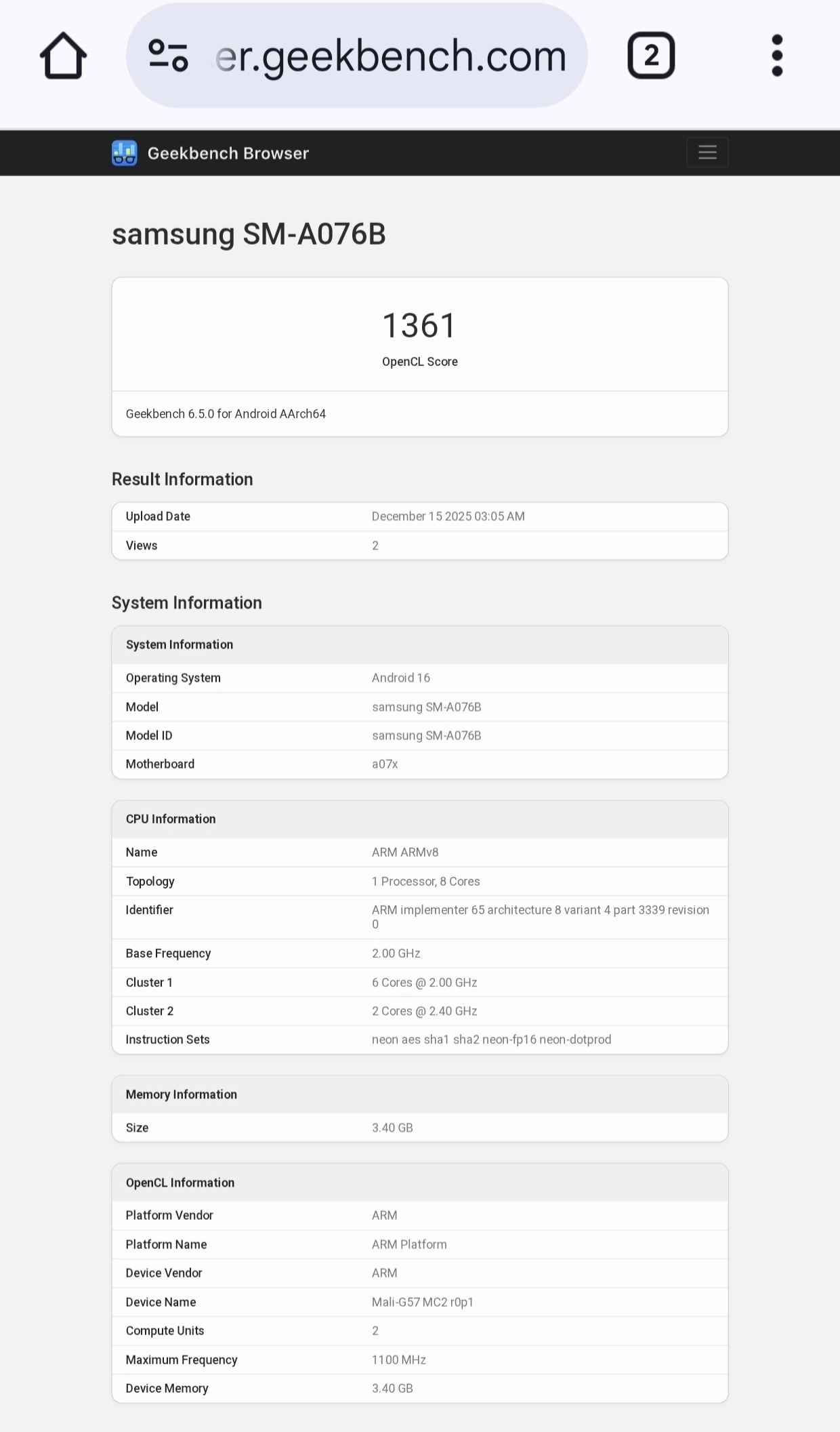 SM-A076B model numarasına sahip olan cihaz, OpenCL testinde 1361 puan aldı. Telefonun 2.4 GHz saat hızına ve Mali-G57 MC2 r0p1 GPU’ya sahip bir işlemciye sahip olduğu belirtildi. Pratikte bu MediaTek tarafından geliştirilen Dimensity 6300 çipini sembolize ediyor.