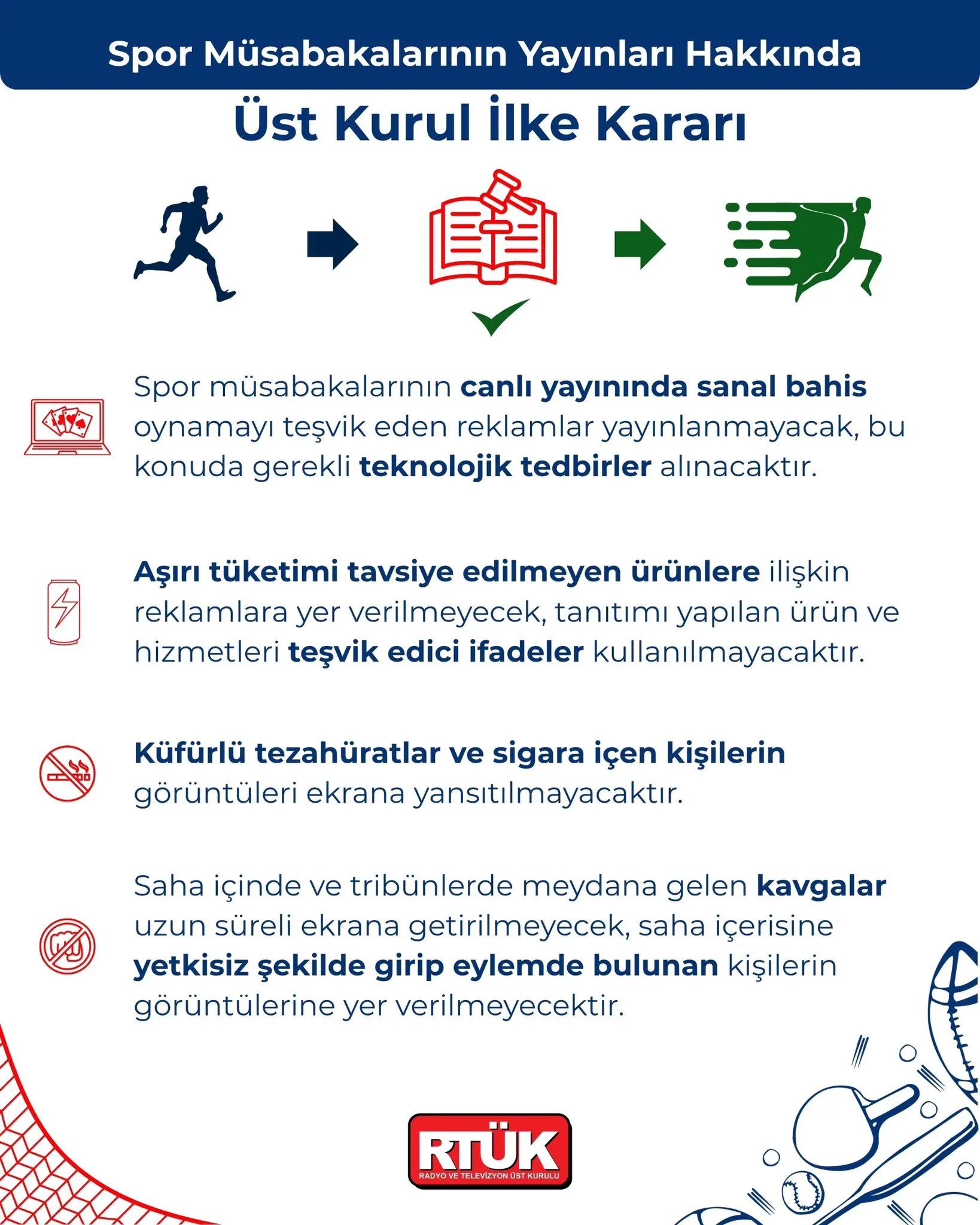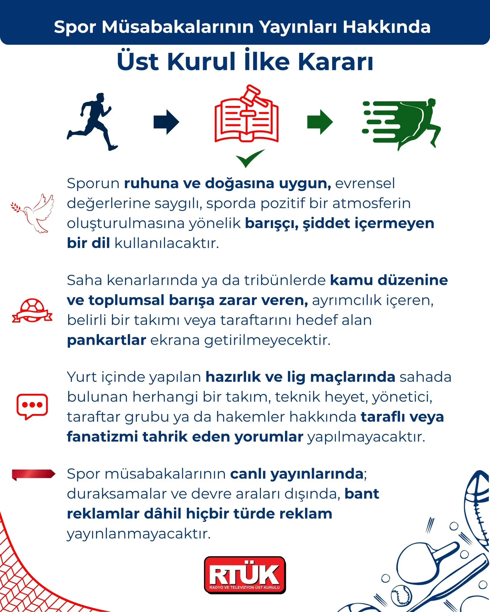 RTÜK tarafından spor yayınlarında şiddet ve fanatizmin önüne geçilmesi adına belirlenen 8 maddelik yeni ilke kararları belli oldu. Bu bağlamda artık canlı müsabaka sırasında devre arası ve oyun duraksamaları dışında bant reklam dahil hiçbir reklam türüne izin verilmeyeceği belirtildi.