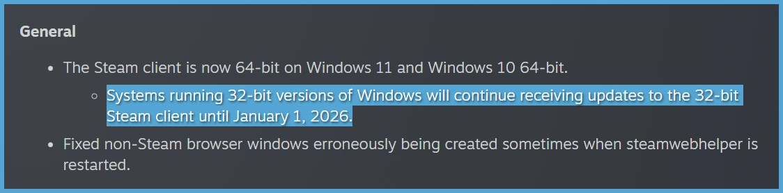 - 1 Ocak 2026'dan itibaren Steam istemcisi 32-bit sistemlerde yeni özellikler veya güvenlik yamaları almayacak.