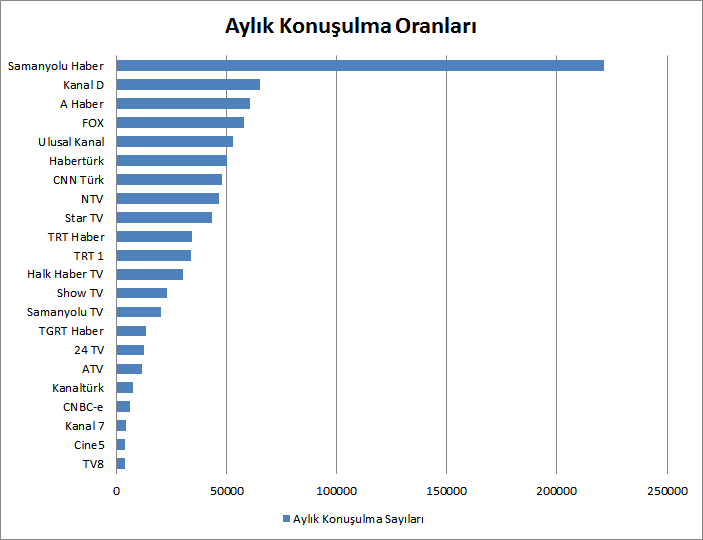 Araştırmada Twitter takipçi sayılarına göre sıralama; NTV, CNN Türk, Habertürk, CNBC-e, TRT Haber, Star TV, Kanal D, Show TV, Ulusal Kanal, Samanyolu TV, ATV, TRT 1, FOX, A Haber, Samanyolu Haber, Kanaltürk, Halk TV, TV8, TGRT Haber, Kanal 7, 24 TV ve son sırada Cine 5 olarak sıralanmakta. Facebook hayran sayılarına göre sıralama ise; Star TV, ATV, Kanal D, Show TV, Habertürk, CNBC-e, FOX, NTV, TRT Haber, Samanyolu Haber, TRT 1, Ulusal Kanal, Samanyolu TV, CNN Türk, Kanal 7, TGRT Haber, Kanaltürk, TV8, A Haber, Cine 5, 24 TV ve son sırada Halk TV olarak sıralanmakta.