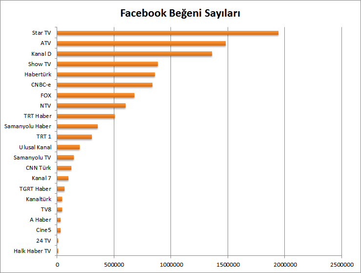 Facebook beğeni sayılarına göre değerlendirme yapıldığında ise reyting sonuçlarına biraz daha yakın sonuçlar elde etmek mümkün. Star TV büyük bir farkla birinci olurken ATV ve Kanal D ikinci sıra için yarışmaktalar. Araştırma sonuçlarına göre Twitter’da daha çok haber kanalları takip edilirken, Facebook’ta genel kategorideki TV kanallarının daha çok takip edildiğini söylemek mümkün.