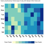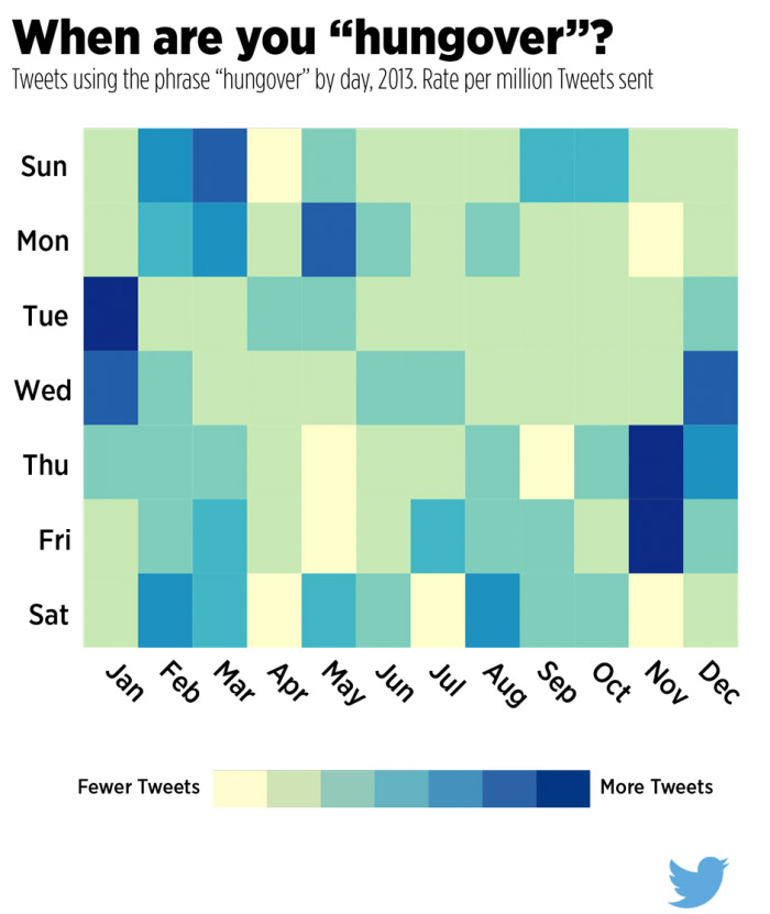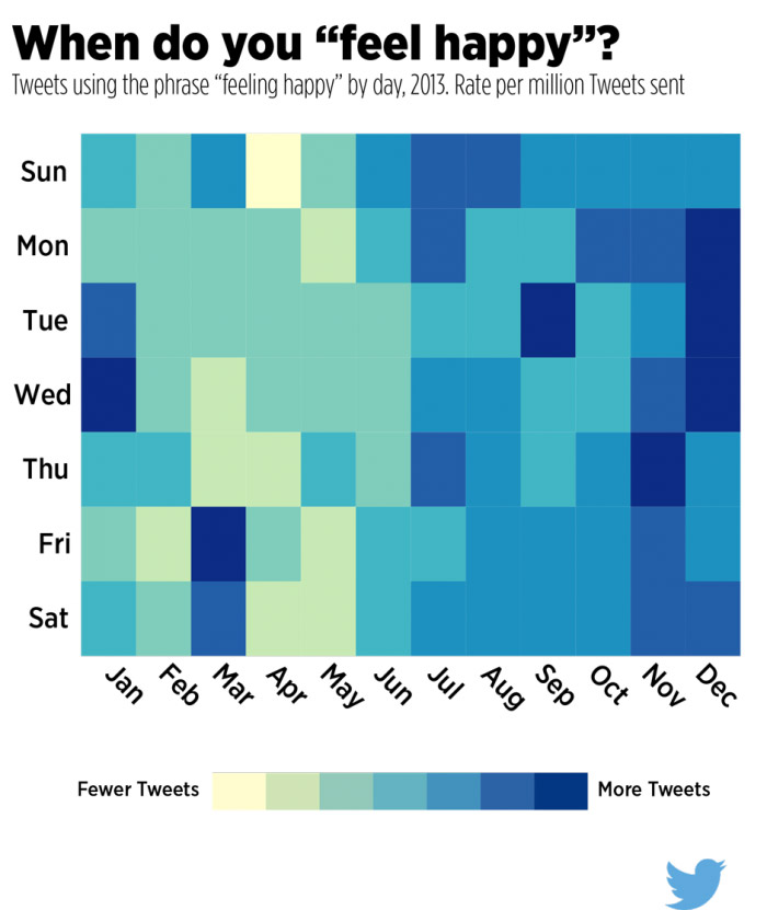 Görseller halinde hazırlanan istatistiklere baktığımızda kişilerin sahip olduğu duyguları attığı tweetlere nasıl yansıttıklarını görebiliyoruz. Verilere göre bir Twitter kullanıcısının en mutlu olduğu zamanlar Aralık ayı ve Salı günlerine karşılık geliyor. Üzgün olduğu zamanlar ise ortalama olarak yine Aralık ayına denk geliyor. Ayrıca kişilerin en çok işe geç kaldığı zaman Temmuz ayı ve Çarşamba ve Cuma günleri olarak belirtilmiş. En ilginç istatistik ise kullanıcıların akşamdan kalma olduğu zamanlar. Kullanıcıların en fazla alkol aldığı ay ve günler ise Kasım ayı ve Perşembe-Cuma günleri olarak belirtilmiş.