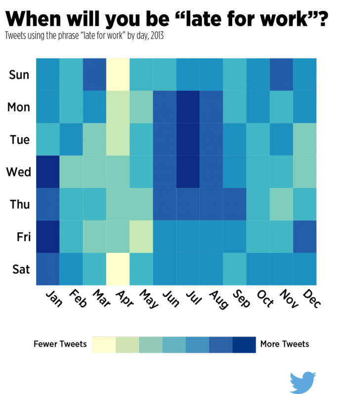 Twitter bugün ilginç bir istatistik yayınladı. İstatistik, atılan tweetlerin yoğunluğuna göre Twitter kullanıcılarının hangi günler ve hangi aylarda mutlu veya üzgün olduğunu, işe en çok ne zaman geç kaldığını ve kullanıcıların hangi zamanlarda akşamdan kalma olduğunu gösteriyor.